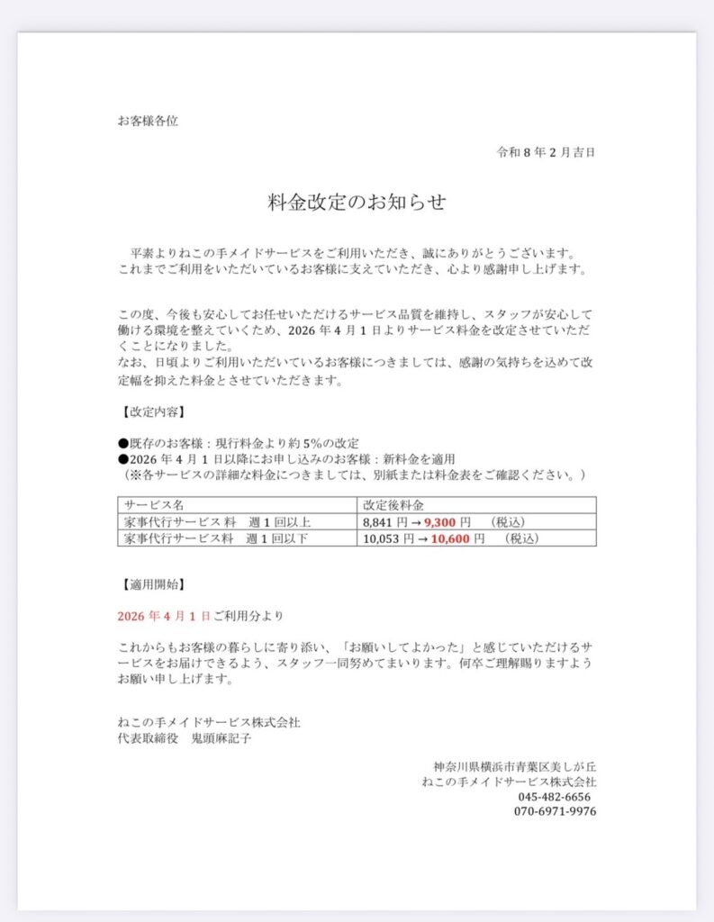 みなさま、いつも大変お世話になっております。2026年4月1日よりサービス料金を改定させていただくこととなりました。今後もご満足いただけるサービスをご提供できるよう努めてまいります。何卒ご理解を賜りますようお願い申し上げます。